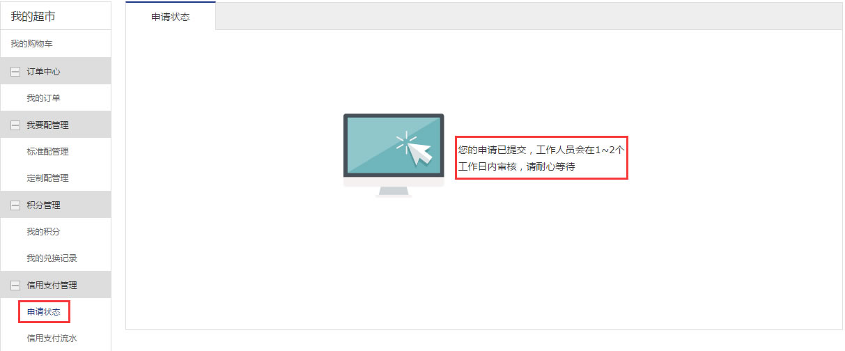 一、信用支付申请1、用户登录后点击页面左上角账号进入我的超市—信用支付管理—申请状态,尚未申请的用户显示状态为“尚未申请信用支付”。