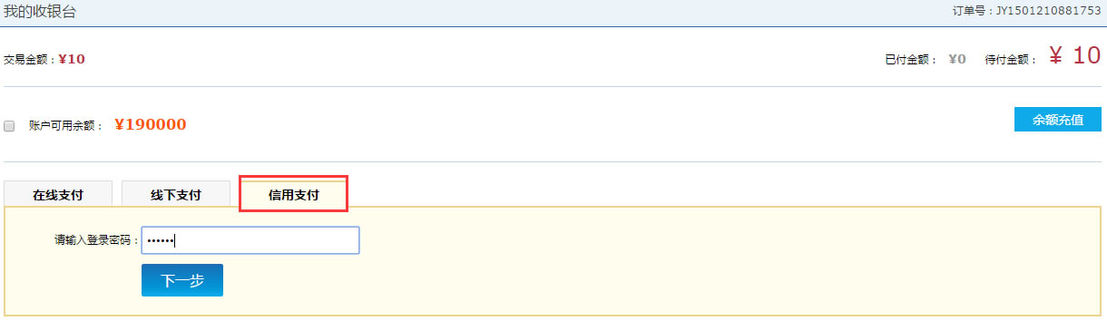 1、信用支付申请成功后,在订单选择付款时,可以点击信用支付按钮进行信用支付。